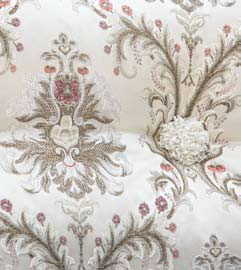 Диван обильно декорирован: короткая бахрома вшита в край подушек, на подлокотниках – складки, заложенные вручную. Пушистая бахрома по основанию дивана, гладкий цоколь оформлен розетками.